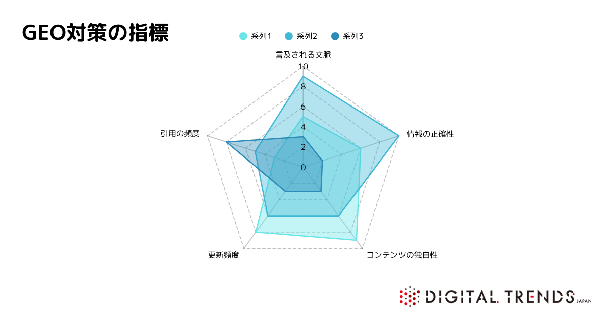 GEO対策は、従来のSEO対策における指標とは異なる観点で評価されます。
