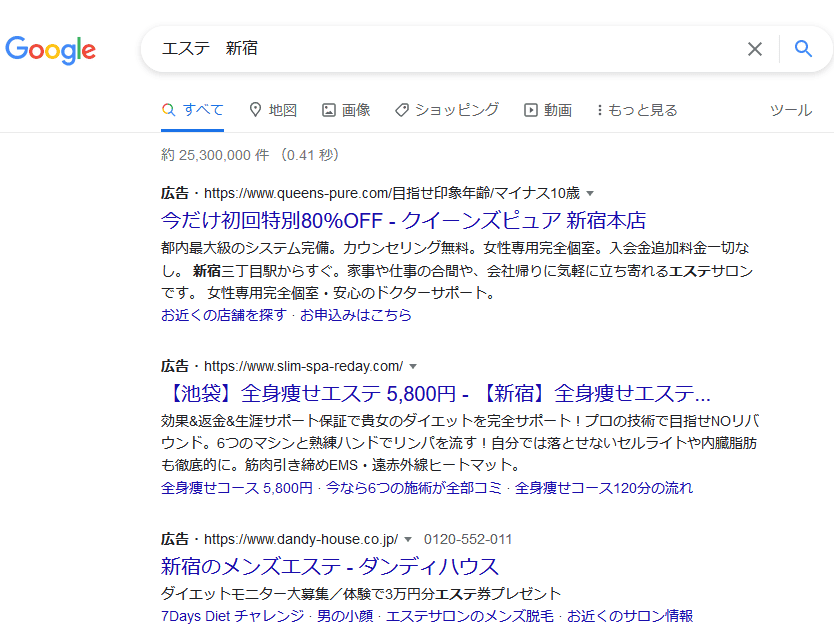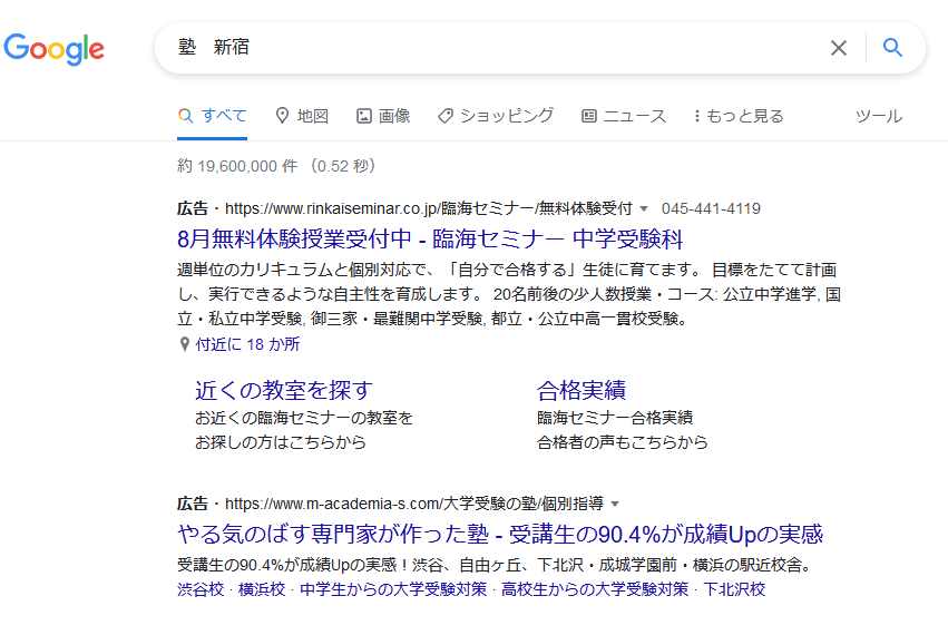 エステ業界の方が「新宿」と訴求されている広告が多く、塾業界の場合「新宿」といった訴求ができていないことが分かります。これは広告設定の基本的な設定ですので、こうした設定がおざなりになっていても、一定の集客効果を発揮していることが想定されることから、適切に施策を打てば集客自体に苦戦をすることはありません。