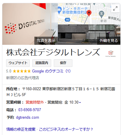 GoogleMAPに表示するためには、Googleマイビジネスへの登録が必要です。登録をすることで、自社名で検索をした際に、上記のように検索結果に表示されます。 GoogleMAPで上位に表示されるためには、立地なども重要ですが、情報がしっかりと入力されていることも重要です。