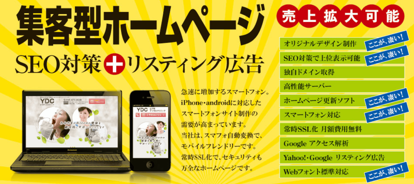 徹底したSEO対策で集客できるホームページを制作します。制作費は30万〜50万円、月額料金は9,800円〜と他社と比較してもリーズナブルです。