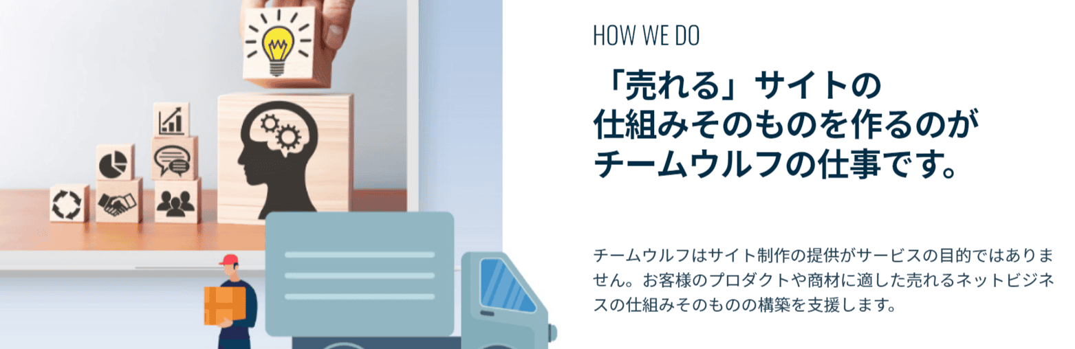 株式会社チームウルフはBtoBに特化したコンテンツマーケティング企業です。自社のBtoBサービスの利用実績は20,000社。そこで得た知識や情報だけでなく、他社のWEBマーケティング、SEO、デザイン制作の技術や知識を得たことにより、サイト制作や広告運用のコンサルティングから開発までワンストップでのサービスが可能です。