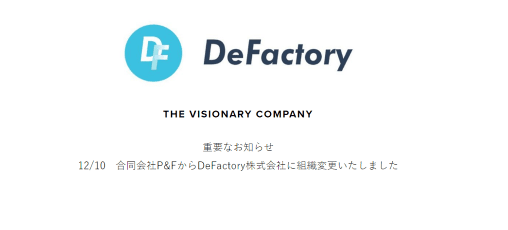 Defactory株式会社はSEO・コンテンツマーケティング事業の会社です。2017年に合同会社P&Fとして設立され、2020年に現在のDefactory株式会社に社名変更しています。