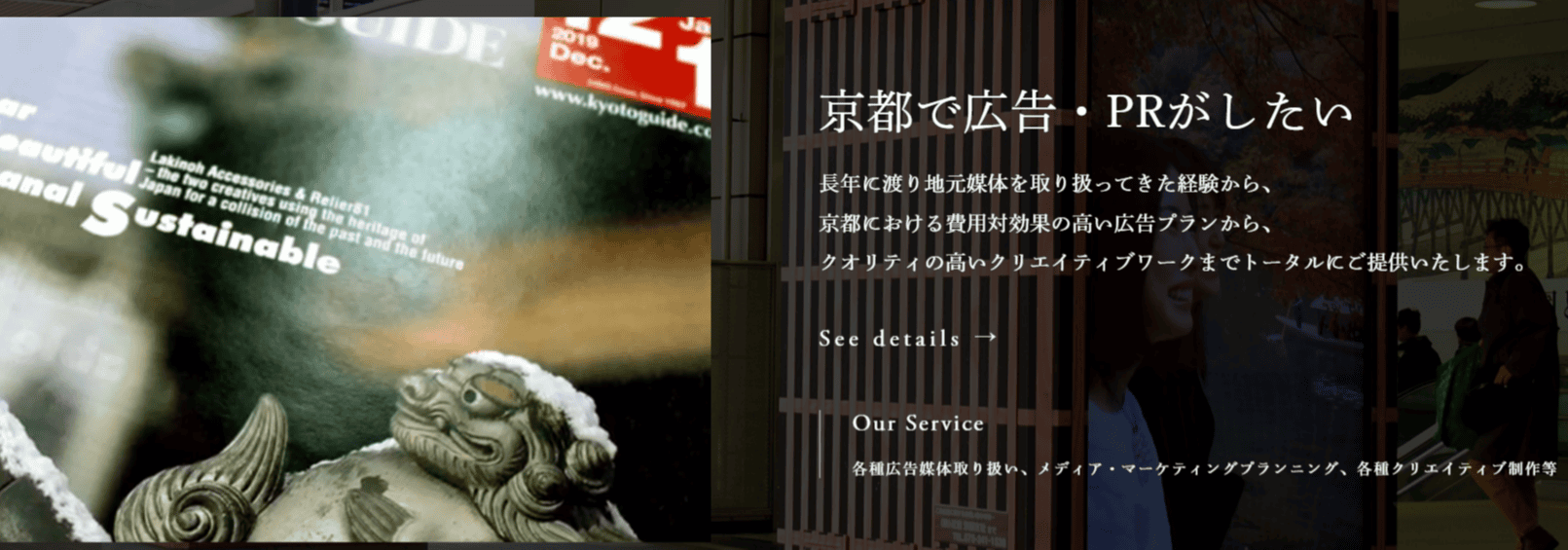 独自のエリアマーケティングのコンテンツ網を使って、京都に特化したブランディング力強化施策や集客ソリューションを提供します。クライアントのサイトを、潜在顧客とのコミュニケーションに活用し、商品やサービスに関心を持ってもらったり、ブランド力を高めたりできるのが強み。
