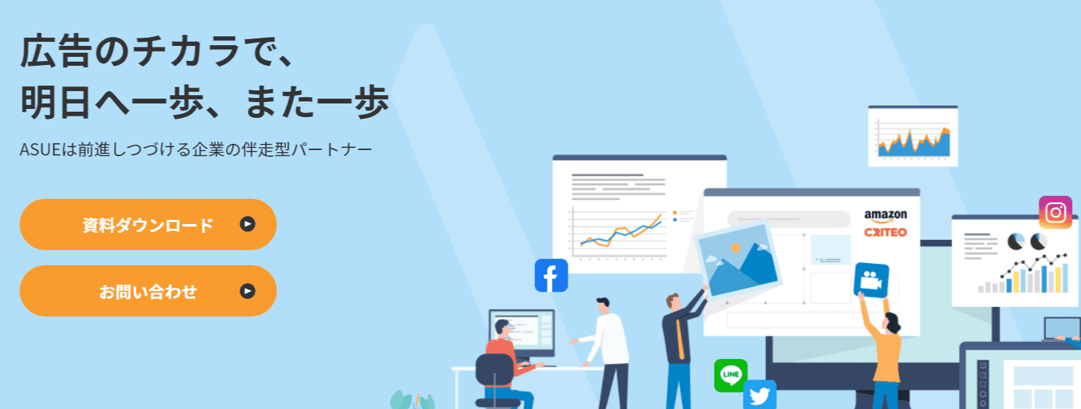 ASUEは広告運用をメインとした、マーケティング会社です。ランディングページなどのWeb制作チームも配置しており、トータルでWebサービス提供をおこなっています。