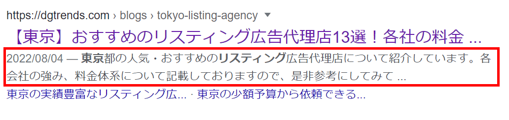 こちらは東京でおすすめのリスティング会社13社をまとめた弊社自社サイトにおける記事のメタディスクリプション例です。