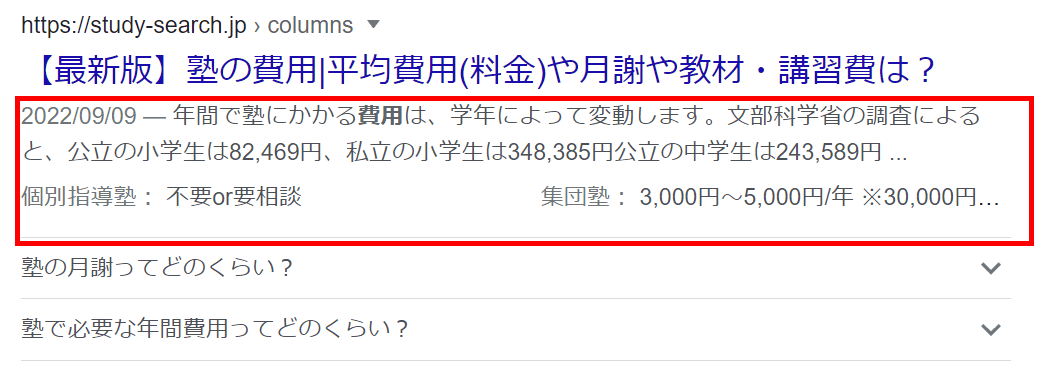 メタディスクリプション内で一部の料金を記すことで気になったユーザーを引き寄せられます。また、文部科学省というワードを出すことで信頼感を築いています。