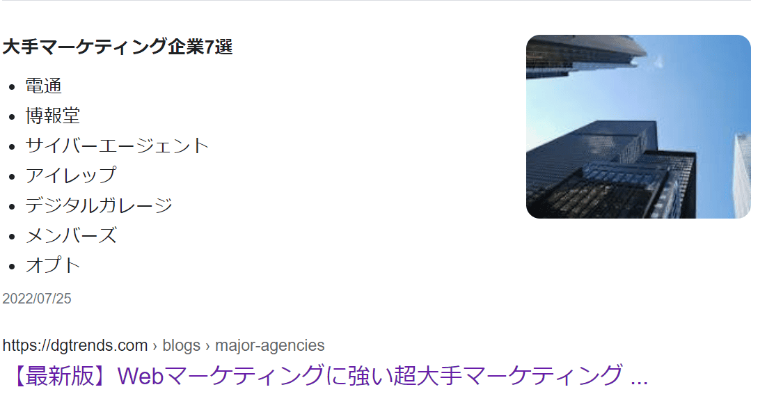 検索結果で横に表示される画像がありますが、この画像のことをサムネイルと呼びます。サムネイルがあることで、ユーザーにどんな記事なのか視覚的に訴求することが出来ます。