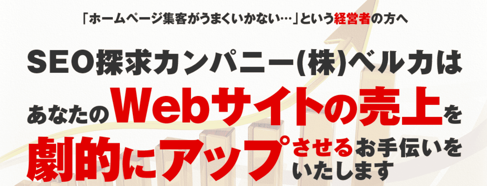 ベルカは集客の成果にこだわりをもち、ホームページへのアクセスアップを約束する会社です。公式サイトでは、ホームページ作成サービス、SEO対策、WEBコンサルを通して顧客のホームページへ集客するとしています。