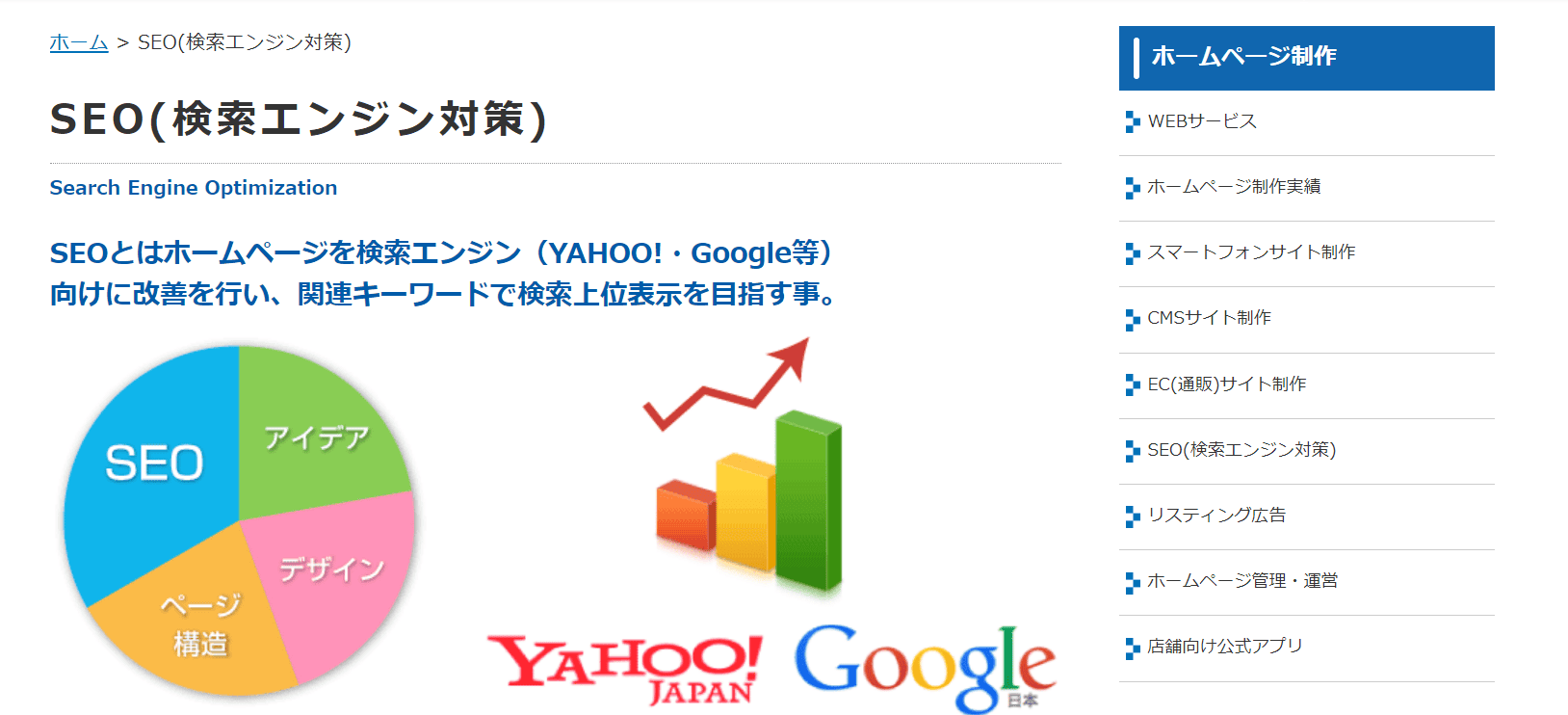 | SEO対策以外のサービス | WEBサイト制作・ネットショップ運営サポートなど |