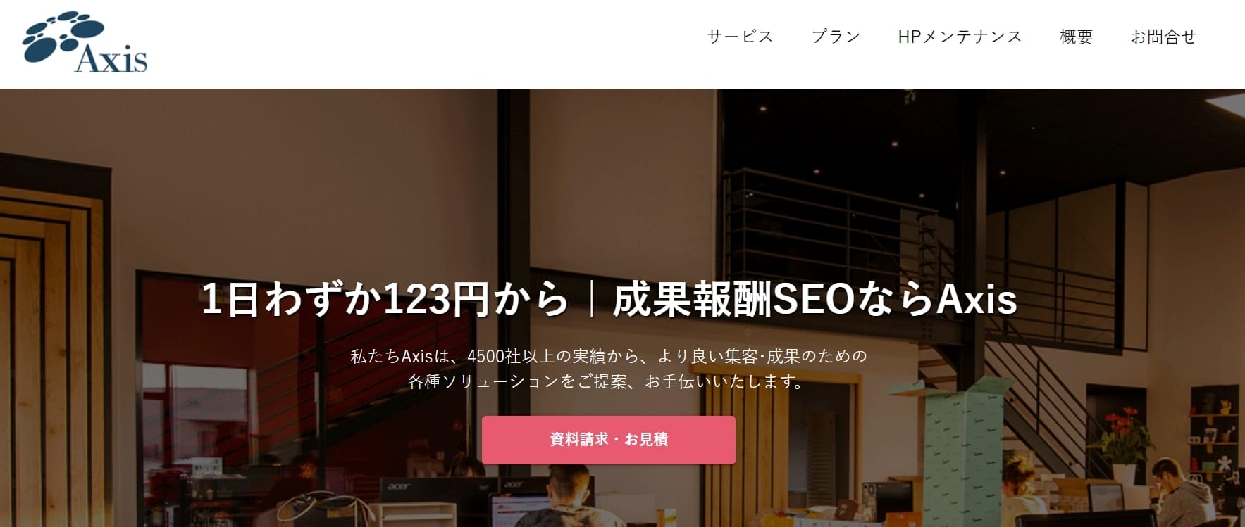 Axisは1日わずか123円から成果報酬型SEOを提供する会社です。固定料金プランでは、1カ月16,500円から、事前調査やキーワード対策のSEO対策を提供しています。プランによっては、月次レポートの提供もあります。