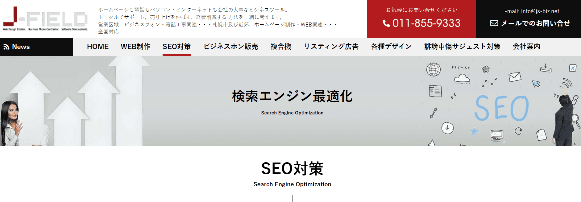 ジェイフィールドはSEO対策の他に、ビジネスホンや複合機などオフィスの備品までトータルサポートを強みとする会社です。SEO対策は、競合の調査やサイトの分析に始まり、内部対策、外部リンク対策など基本に沿ったSEO対策をおこないます。