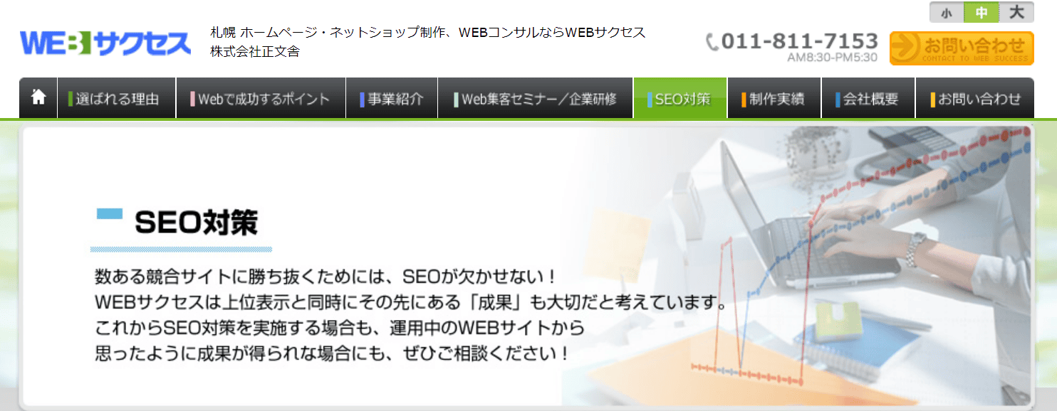正文舎WEBサクセス事業部は、ホームページ制作に強みをもつ会社です。ホームページの作り込みによる綿密なSEO内部施策によって成果を狙います。