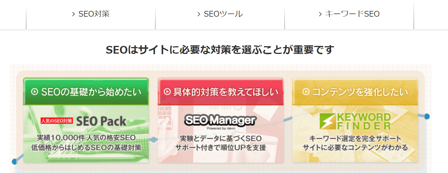 より具体的なSEO対策を望む人には、SEOManagerというプランも用意されています。3カ月プラン176,400円と、料金は高額です。SEOManagerは、より高いSEOの成果を望む人向けの本格的なプランです。