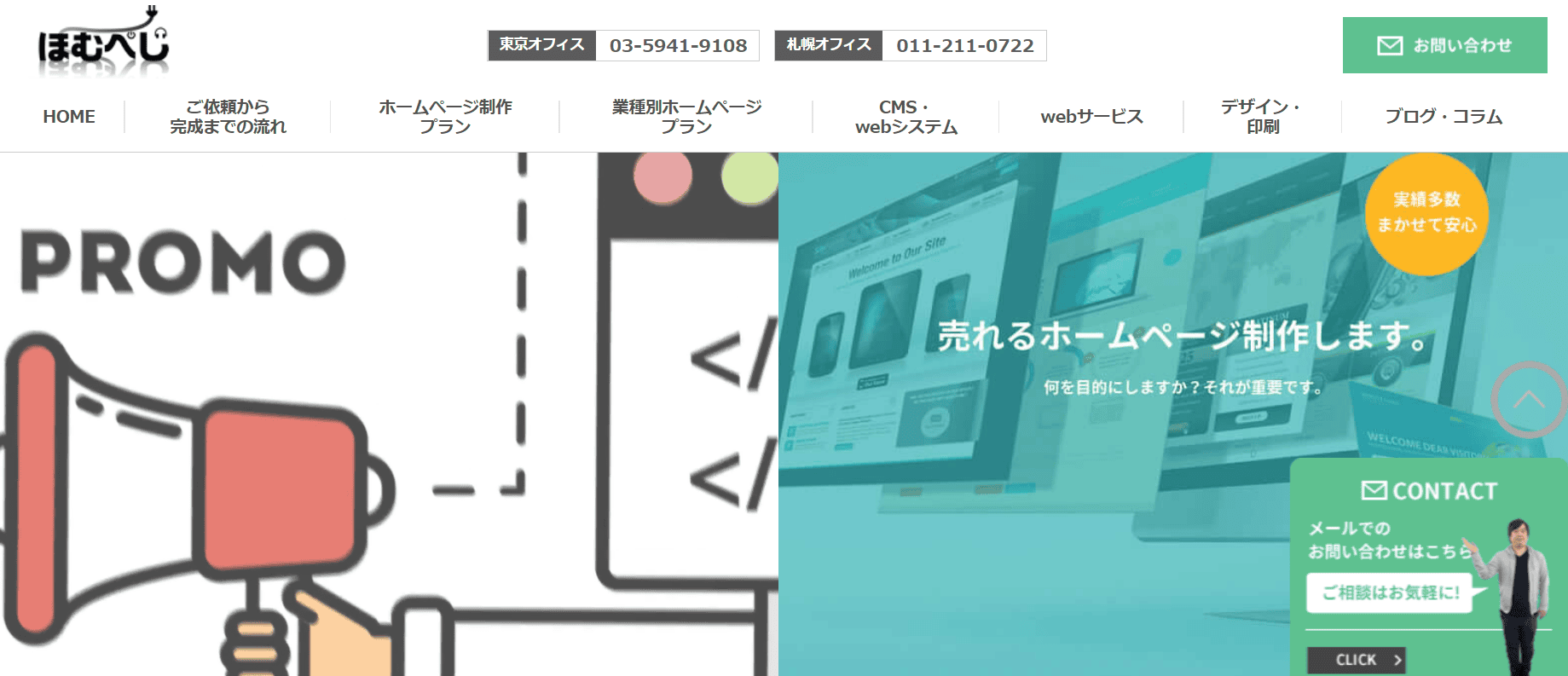 ほむぺじは札幌を拠点とし、東京や大阪にも支店を展開している会社です。モットーは売れるホームページ制作。多岐にわたる業種の制作実績が公式サイトで公開されています。