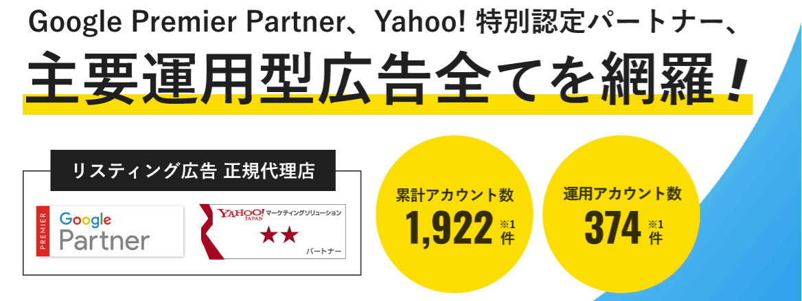 GoogleのPremier Partner Awardsで3期連続国内ファイナリストに選出されており、Yahoo!では国内で35社しかない広告運用認定パートナーとして選ばれている実績があります。