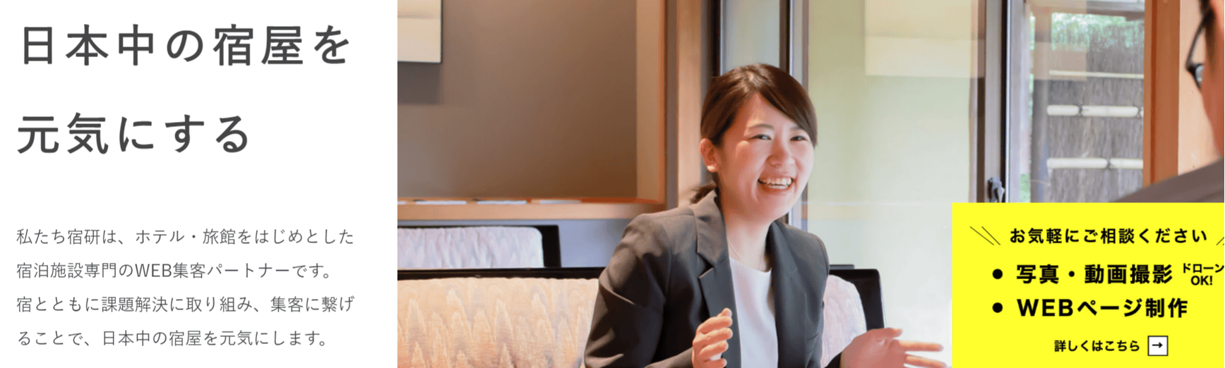株式会社宿研は、旅館やホテルなどの宿泊施設専門のWebコンサルティングを行う会社です。約4,700件の契約実績と、Web売上の前年比205%を達成した実績をもつ、集客に強いWebコンサルティング会社だといえます。