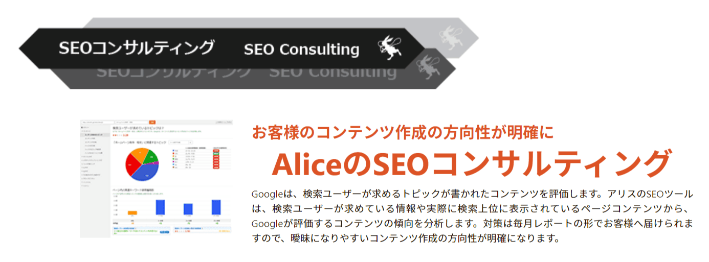 株式会社アリスファクトリーは、月額1万5,000円という低価格からSEOコンサルティングが受けられることが特徴の会社です。