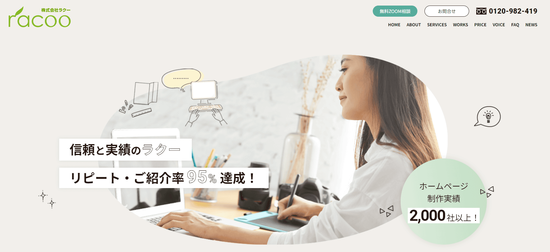 株式会社ラクーは初期費用0円、月額5,200円からホームページ制作を行える制作会社です。安価なだけでなく、SEO対策などのITサービスも対応しています。