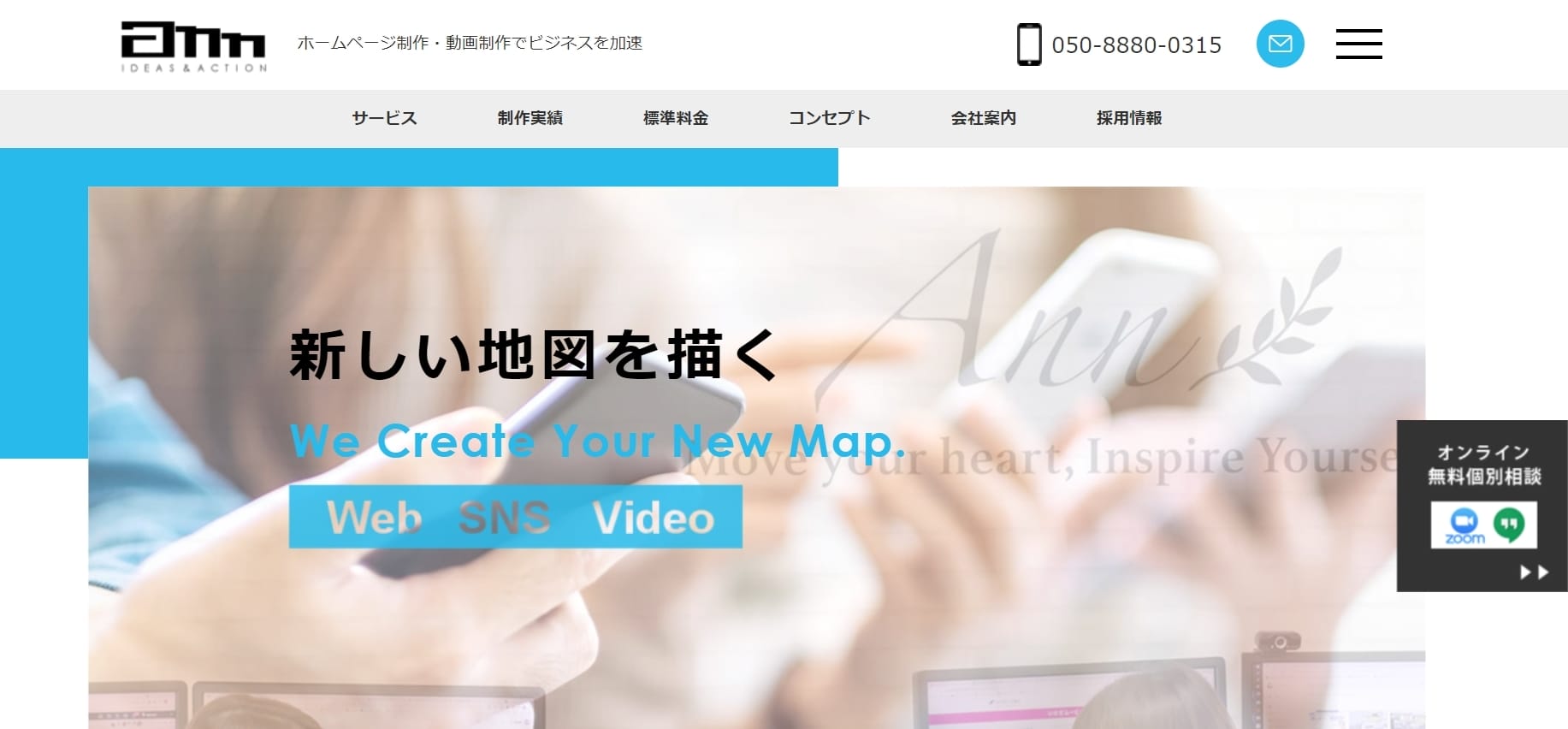 株式会社アンはホームページ制作だけでなくSNS運用や動画制作も行っている、様々なコンテンツを含んだホームページ制作が可能な会社です。Web戦略が得意なので、作った後をイメージしながらホームページの企画・設計・制作を依頼できます。