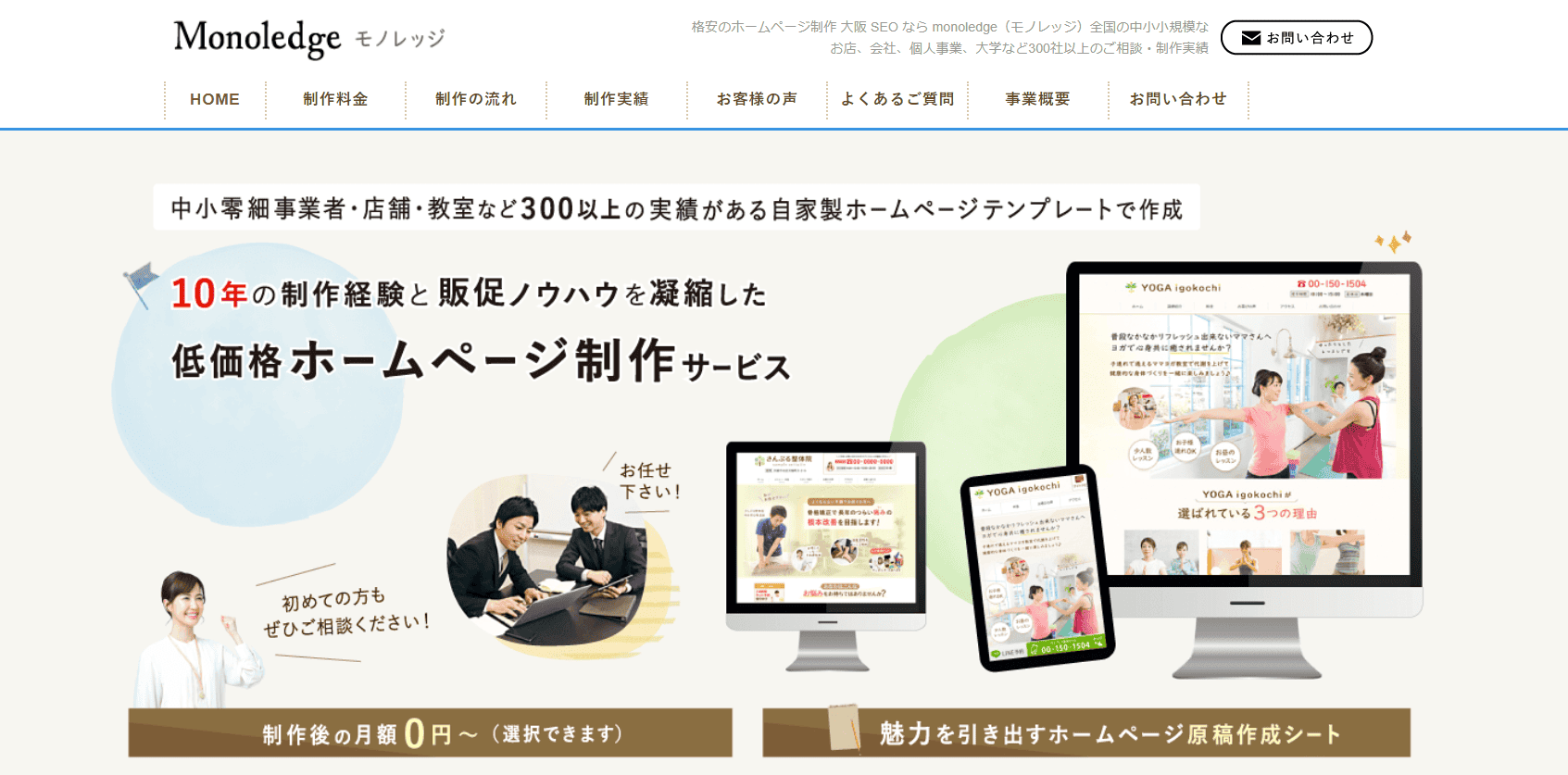 Monoledgeは、創業10年で300社以上の制作実績を持つ大阪市のホームページ制作会社です。特に中小企業や店舗、教室、個人事業主などのコーポレートサイトやランディングページ制作を得意としています。