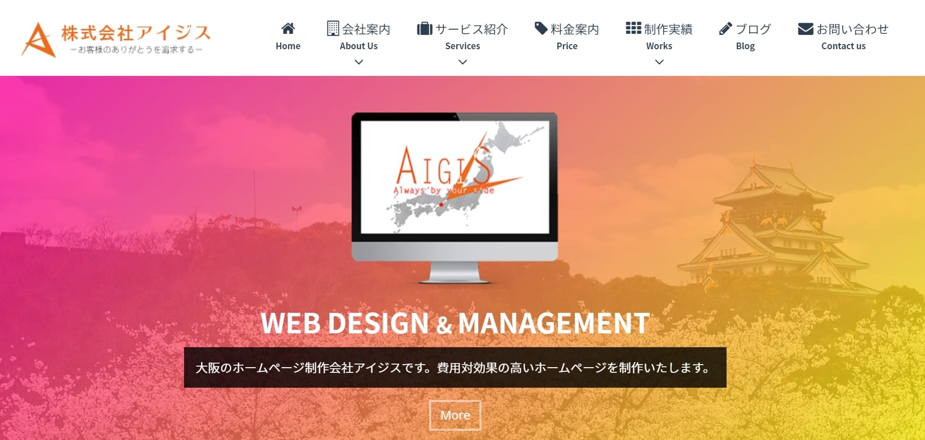 株式会社アイジスは、中小企業のホームページ制作と運営を中心に行う大阪市の制作会社です。WordPressを使った制作が得意で、制作コストを削減しながらも更新しやすいホームページを制作できます。テンプレートデザインを利用した場合、レスポンシブサイトを30万円以下で依頼可能です。