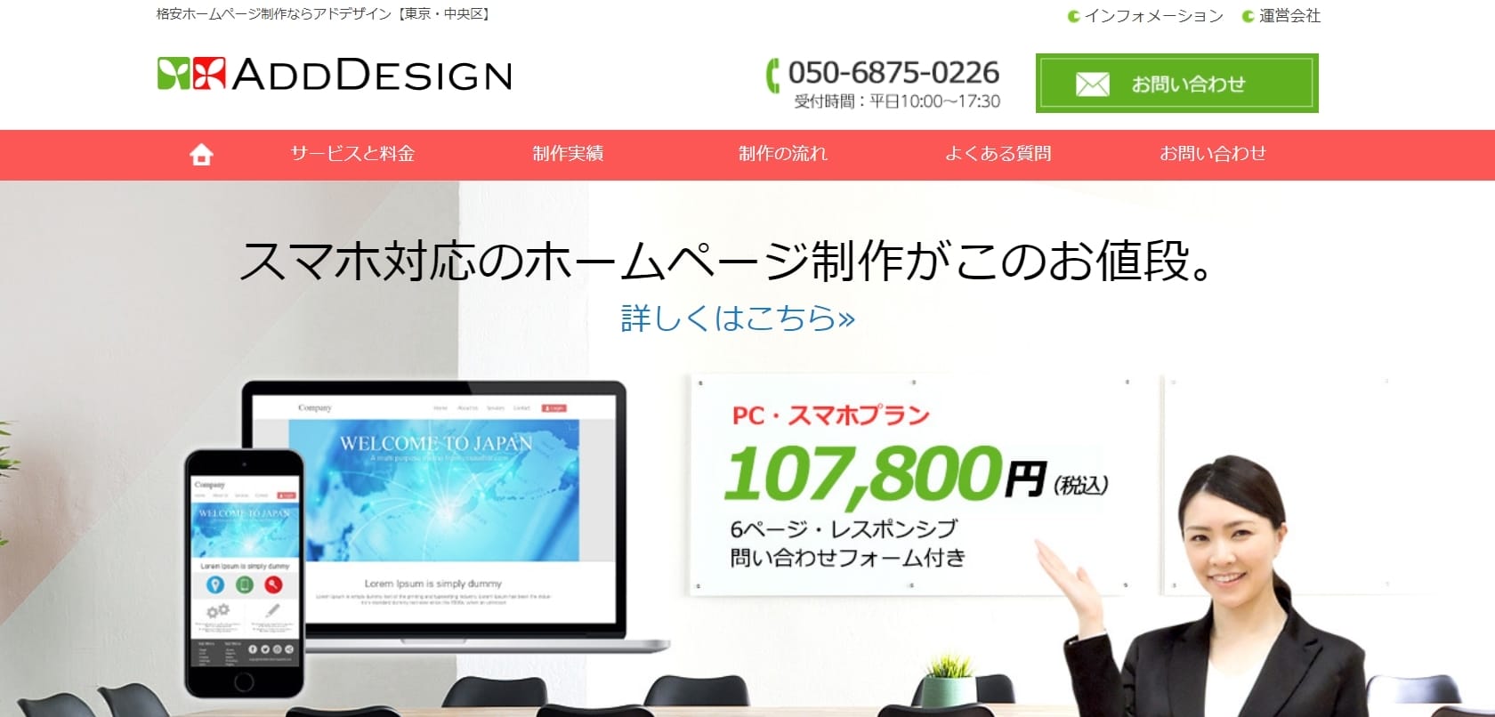 ADDDESIGN株式会社は、スマホ対応のホームページ制作を9万8,000円で提供しており、手軽にレスポンシブデザインのホームページを制作出来ます。