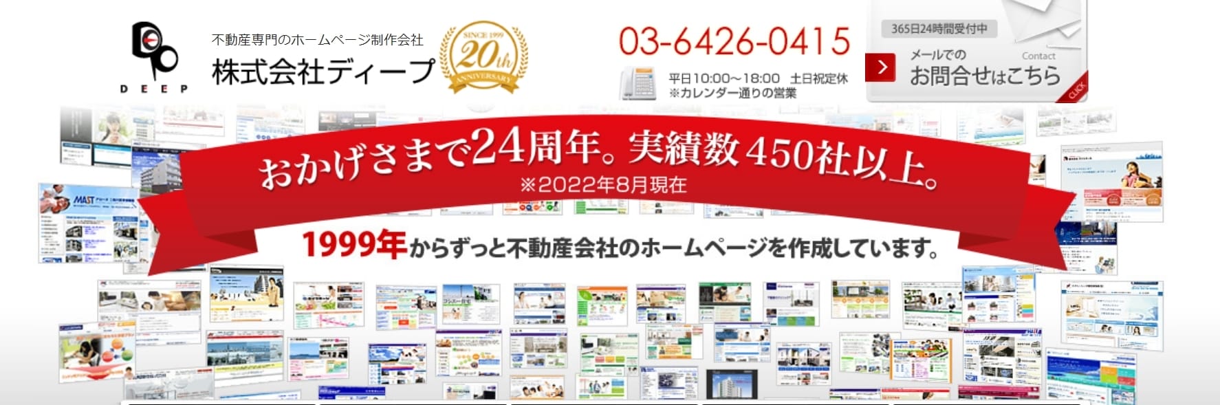 株式会社ディープは不動産会社専門のホームページ制作会社として、20年以上の実績をもちます。実績のほぼ100%は不動産会社のホームページ制作であり、Webマーケティングだけでなく、経営や営業レベルでの深い提案が可能です。